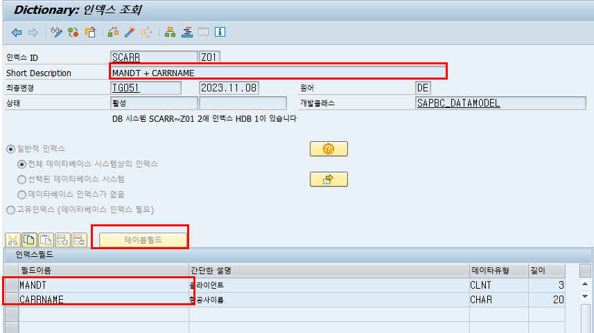 2) Z로 시작하는 3자리 인덱스 이름 입력 후 Enter 누른 다음, Short Description 및 테이블 필드 추가해준다.