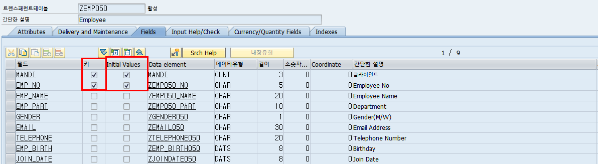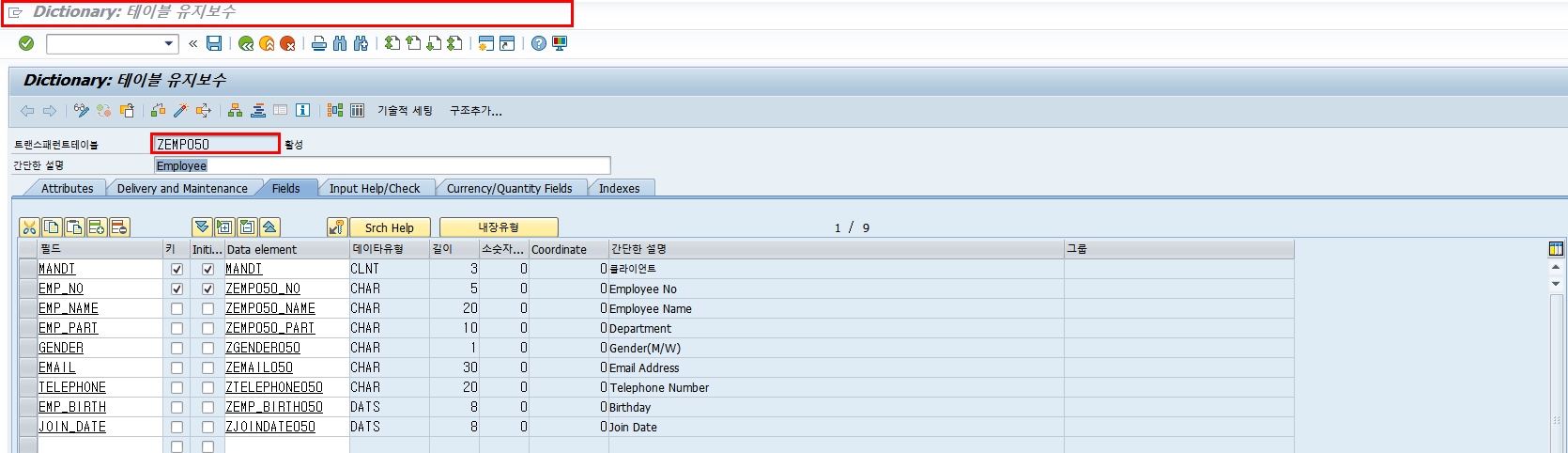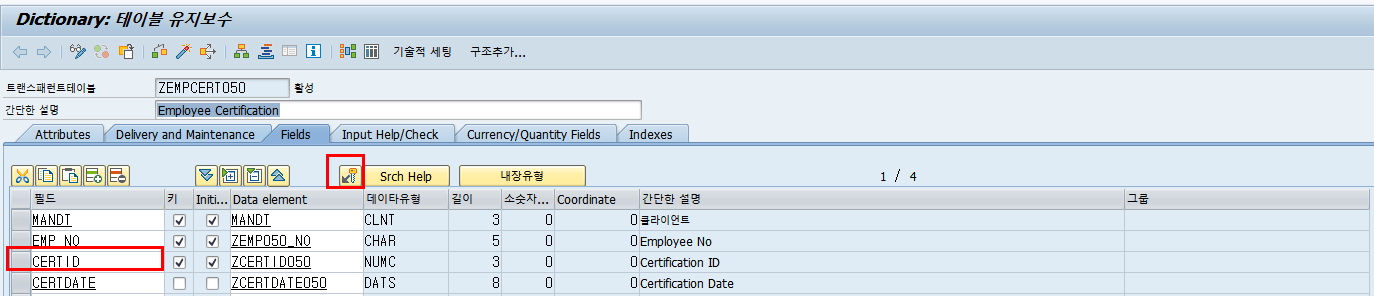 T-CODE: SE11에서 ZEMP050테이블에 자격증 정보 테이블 ZCERTINFO050를 추가하는 경우를 아래 그림으로서 보여줌.