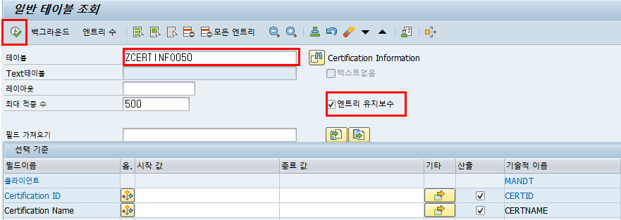 T-CODE: SE16N을 넣고 테이블 이름에 만들었던 테이블 이름 넣고 Enter 하면