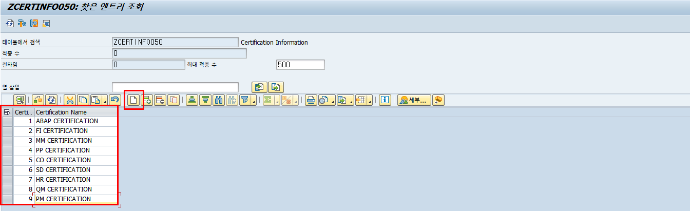 1) T-CODE: SE11에서 사원 자격증 테이블(여기에서는 ZEMPCERT050) 입력하고 Change 버튼을 선택한다.