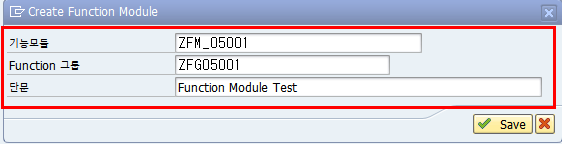 2) Function Module 명에 자신이 정한 Module 명을 적고 Function Group 명도 앞에서 생성한대로 입력한다.