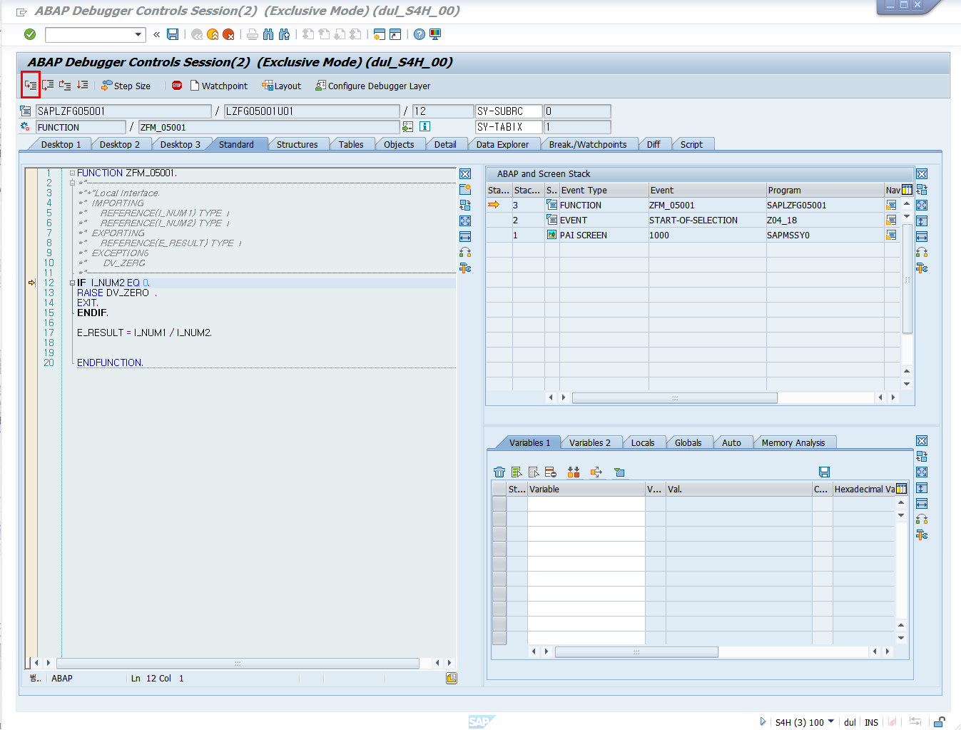 6) ABAP 프로그램에서 Function Module을 호출하는 지점에서 중단점이 활성화되면,