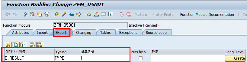 4) [Export] 탭에서는 ABAP 프로그램에 결과값을 전달할 파라미터 E_RESULT를 정수형 타입 I로 정의한다.