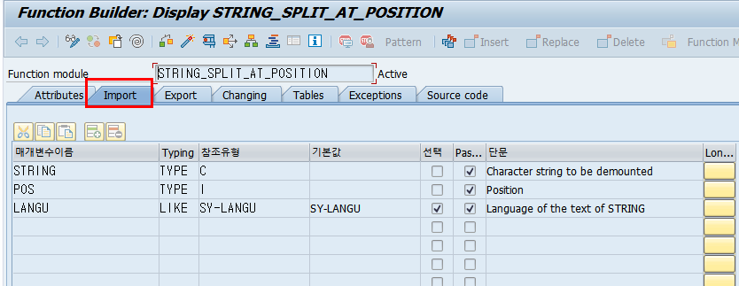 se37 화면에서 'STRING_SPLIT_AT_POSITION' Function Module을 선택하고 display 버튼을 클릭한다.