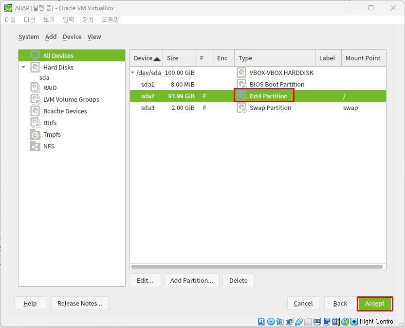 - Ext4 Partition으로 유형변경되었는 지 확인 후 'Accept' 버튼 누르기