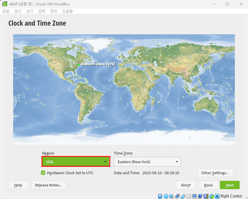- TIme Zone 처음에는 호환을 위해 USA로 지역 설정 후 'Next'