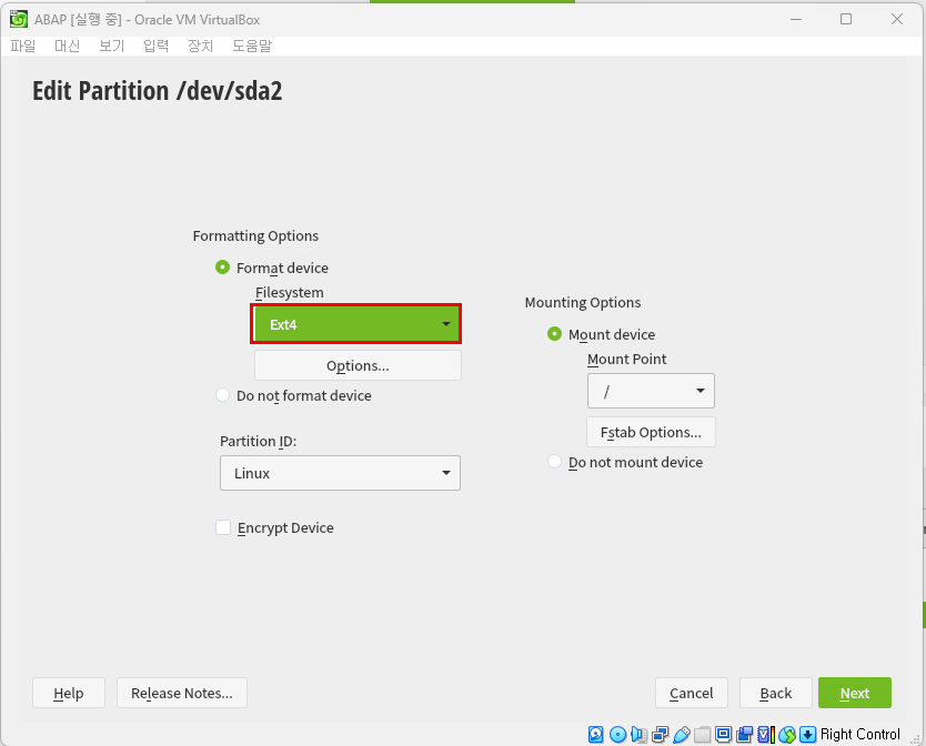 - 'Edit Partition/dev/sad2' 의 Formatting Options에서 Format device 선택 후 Filesystem도 Ext4로 변경