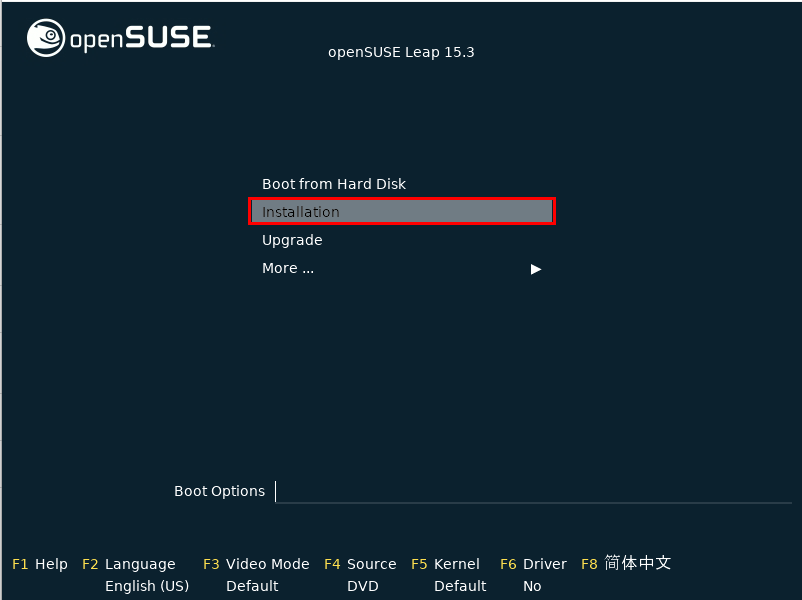 - OpenSUSE 설치가 끝나면 리붓이 진행되고, 리붓 후 다시 boot from hardisk 를 선택하면 위 화면이 나오면