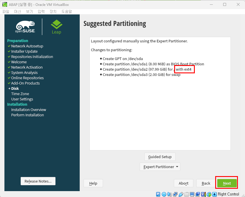 (Ext4로 변경하는 이유는 넓은 용량을 구축해놓고 사용하기 위해서입니다.) - 'Next' 버튼 누르기