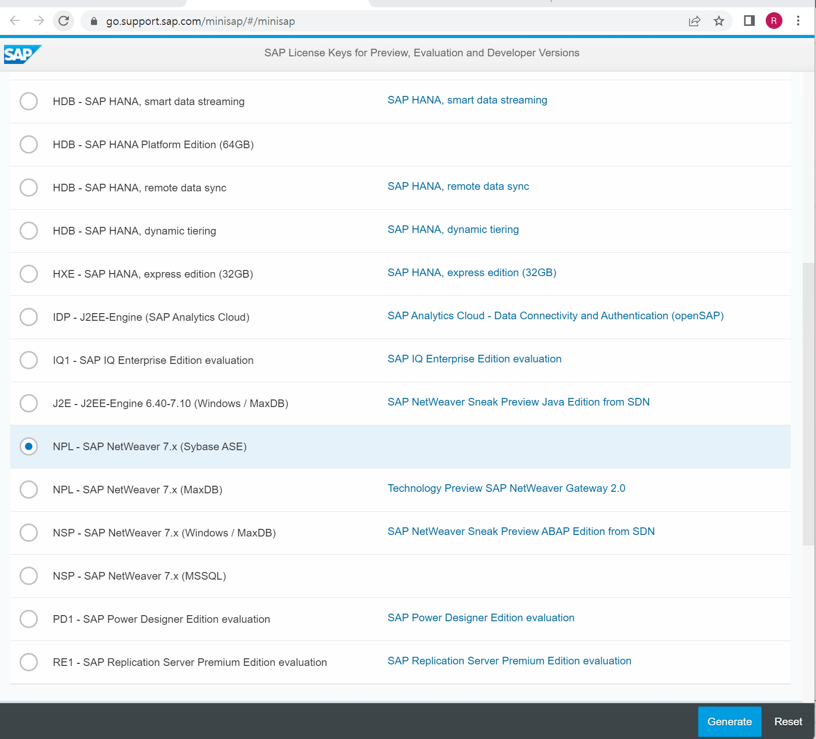- https://go.support.sap.com/minisap/#/minisap 에 접속하여 NPL-SAP NetWeaver 7.x(Sybase ASE) 선택